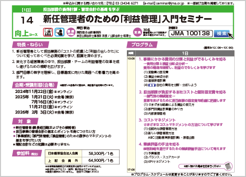 《参加対象・このような方におすすめです》・新任管理者(課長相当職およびその候補者)・担当事業の管理会計の基本とポイントを身につけたい方・「事業部別」「部門別管理」「損益管理」のための数字のマネジメントの 基本を学びたい方*簿記会計などの知識は必要ありません