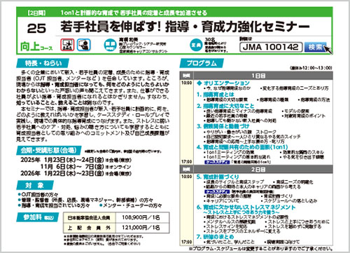 本セミナーでは、指導・育成担当者が新入・若手社員に計画的に、何を、どのように教えればいいかを学習し、ケーススタディ・ロールプレイで実践し、現場での具体的な指導育成につなげます。また、ストレスに弱い若手社員へのケア・対処、悩みの聴き方についても学習するとともに育成担当者としての取り組みへのコミットメント及び自己成長課題が見えてきます。