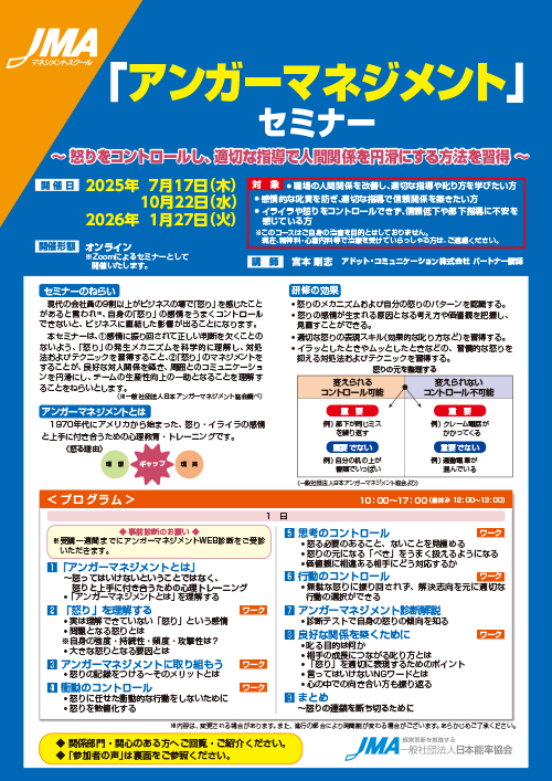 ・イラッとしたときやムッとしたときなどの、習慣的な怒りを抑える対処法およびテクニックを習得する。