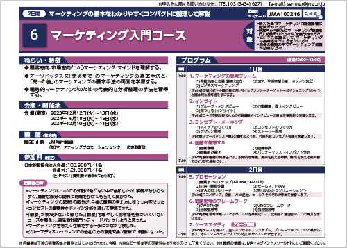 ・オーソドックスな「売るまで」のマーケティングの基本手法と、「売った後」のマーケティングの基本手法の両面を学習する。