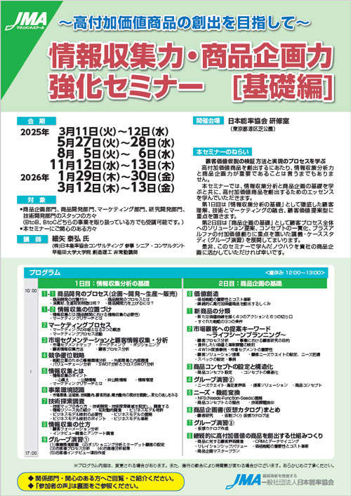 本セミナーでは、情報収集分析と商品企画の基礎を学ぶと共に、高付加価値商品を創出するためのエッセンスを学んでいただきます。