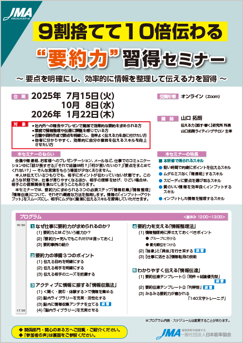 本セミナーでは、要約力に求められる3つの必須ステップ「情報収集」「情報整理」「情報伝達」について、それぞれ最適な方法を指南します。情報の「インプット→アウトプット」をスムーズにし、相手にムダなく簡潔に伝えるスキルを習得していただきます。
