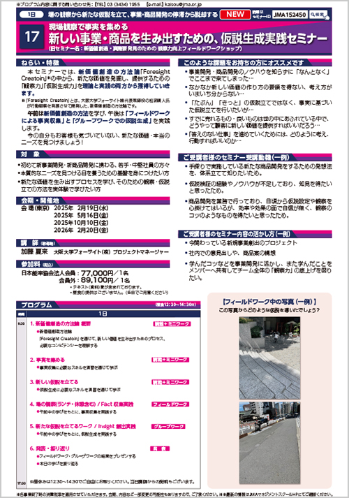 本セミナーでは、新価値創造の方法論「Foresight Creatoin」の中から、新たな価値を発掘し、提供するための「観察力」「仮説生成力」を理論と実践の両方から獲得していきます。