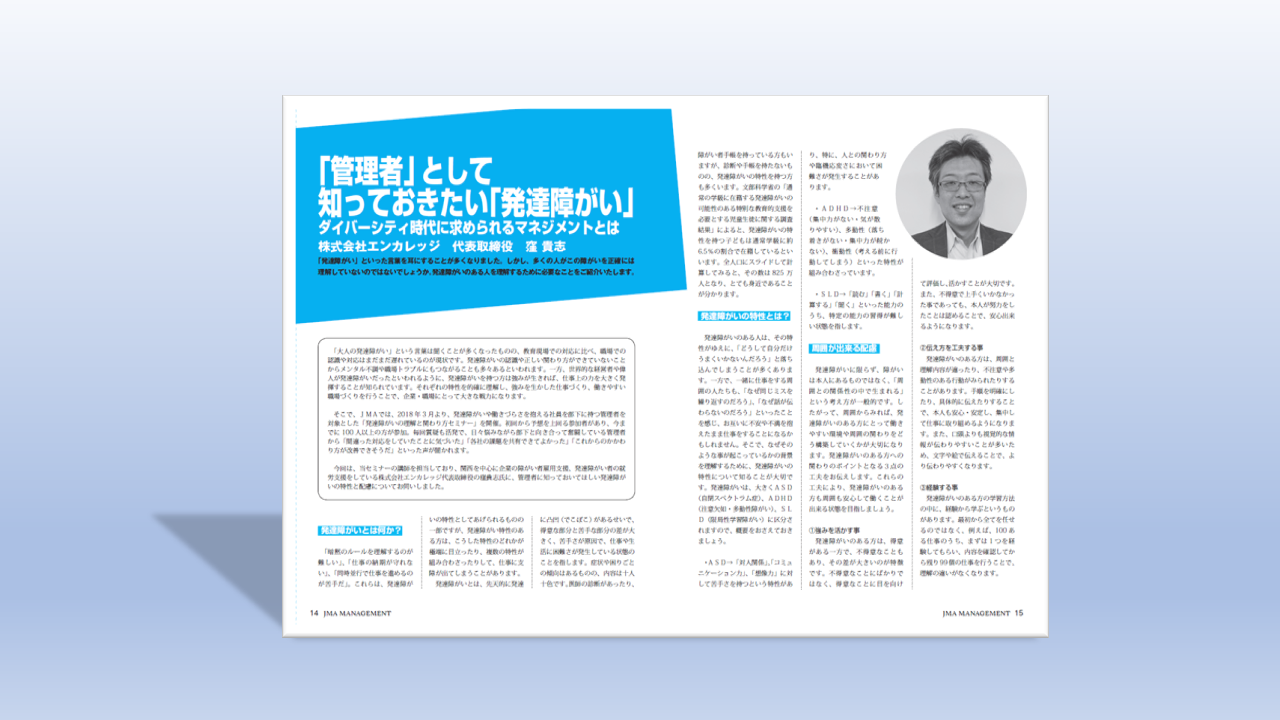 本資料では「大人の発達障がい」についてご紹介しています。最近、「発達障がい」という言葉を聞くことが多くなったものの、教育現場での対応に比べ、職場での認識や対応はまだ遅れているのが現状です。そこで、管理者に知っておいてほしい発達障がいの特性と配慮についてご紹介します。